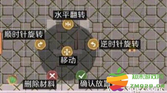 6、【门】和【其他】分类下的材料,在地皮中点击后会出现控制按钮,可以通过翻转、旋转、移动能功能来控制材料位置。