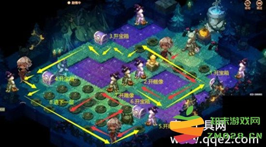 3.按红色路线走开启宝箱,点亮雕像,然后进入出现的蓝色光圈