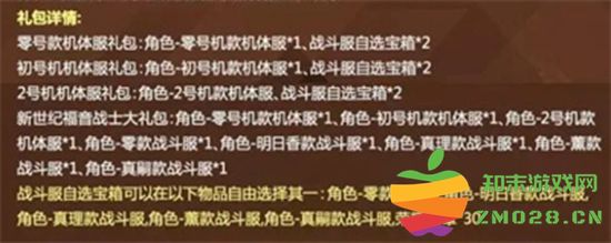1、礼包主要分为零号、初号以及2号机、新世纪福音战士大礼包等四个