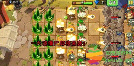 第一、二排种上豌豆荚,看长相很像毛豆。其实是可以在一株植物连续种植5株豌豆荚来提升攻击威力,也就是约等于5颗豌豆射手的输出,很节省地形。并且搭配火炬树桩,杀伤力大增。地刺对踩到他的僵尸造成伤害,所以可以种在离僵尸最近的地方。土豆地雷一触即爆,但是准备时间有点长。把他种在僵尸前方。