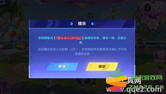 3.系统会自动弹出一个选项框,问你是否要解除情侣关系,点击确定,就会进入冷却期,这里需要玩家注意,冷却期间最好使用男性角色,等冷却期的时间一到就可以再在情侣界面点击分手选项,就可以解除情侣关系了。