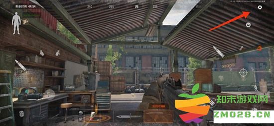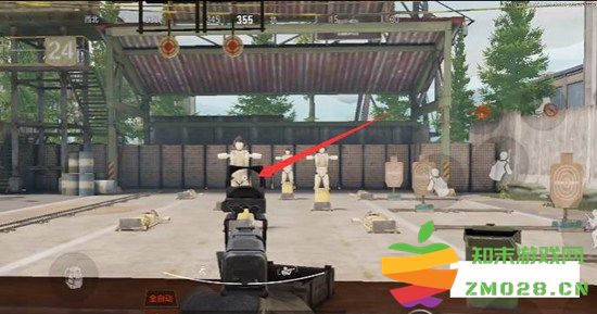 4、然后回到训练营界面,玩家可以开枪射击试一下,观察一下这个设置按钮是否与枪械的准心是一致的,如果两者一致的话,以后就可以将这个设置按钮当作枪的“准心"了,而不一致的话,小伙伴们可以再次进入自定义布局来细调。