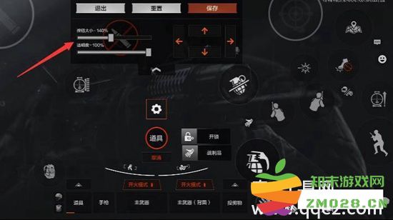 3、进入自定义布局界面,将原本位于屏幕右上方的设置按钮拖拽到屏幕的中间位置,根据自身的需求调准设置按钮的位置和大小遗迹透明度,在调整好设置按钮的位置、大小等之后,点击保存