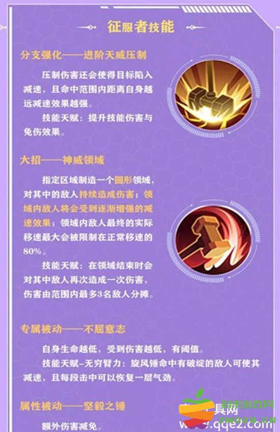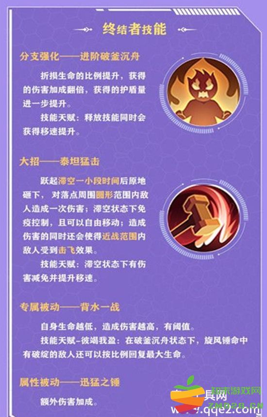 技能天赋:护盾持续期间战锤获得伤害加成,战锤的生命越低,获得的伤害加成就越高,伤害加成有上限。