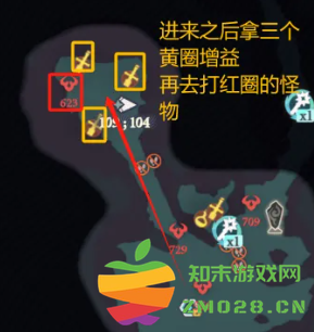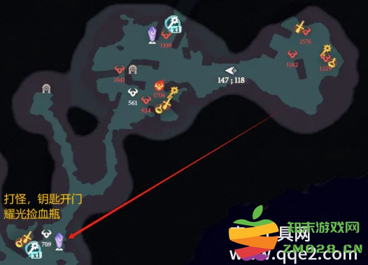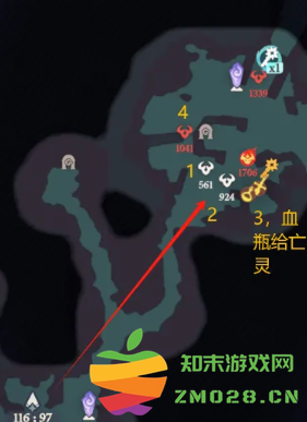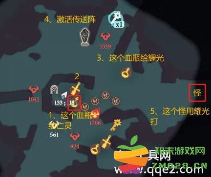 18、之后我们返回之前打不过怪物的区域,按下图的顺序清怪拿奖励,血瓶给亡灵。