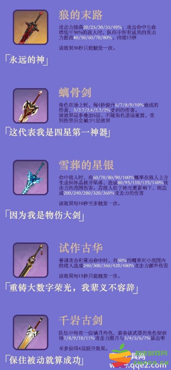 1、武器推荐:狼的末路 > 螭骨剑 > 雪葬的星银 > 试做古华 > 千岩古剑