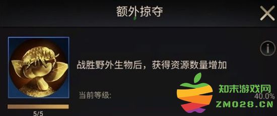 升级后能增加狩猎野外生物所获得的资源数量,最高能提升40%的资源获取量。