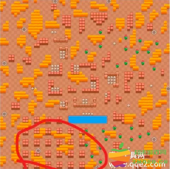 5、黄圈和蓝圈处更适合射手进行骚扰作战,投弹手也可以隐匿于黄圈草丛中伏击,尤其是麦克可以先使用震荡配件妙具进行伏击,这样一般很容易直接团灭一队。