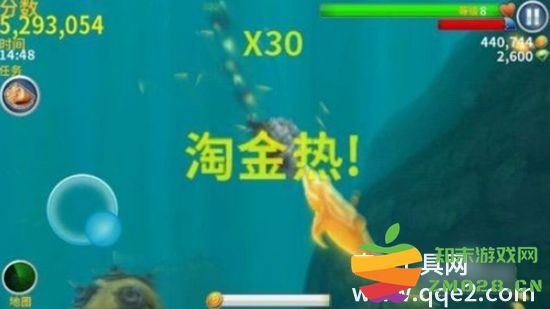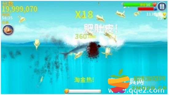 通过游戏中吃人,和各种海洋动物,随机产生的道具,都可以触发鲨鱼的淘金热状态,在淘金热的几秒状态下,鲨鱼吃所有东西都会为它赚取大量金币。
