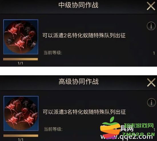 【行军队列I/II/III和特殊行军队列】的“中级协同作战”,能解锁2个特化蚁位置;对于有能力或者喜爱战争的玩家,建议进化出【特殊行军队列】的“高级协同作战”,上阵3个特化蚁,战力提升明显。