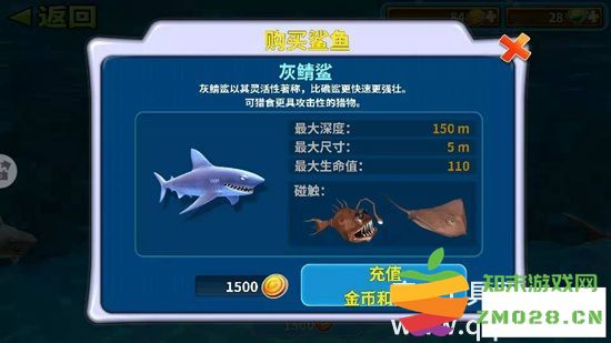 比如说我想解锁大白鲨,这就要求它他前一条鲨鱼大尾虎鲨达到一定的等级,否则我们只能用钻石的方法购买。