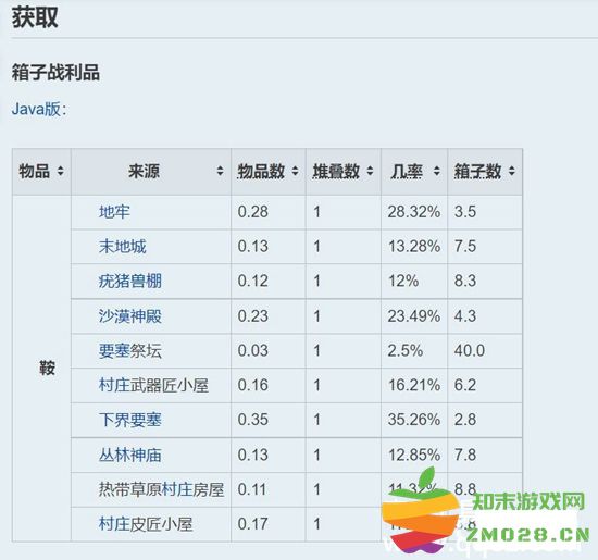 2、但是在1.6.4之后的版本中官方就删除了马鞍的制作方式,玩家只能通过打开地牢中的宝箱获得马鞍。可以在自然生成的建筑内的物品箱中获取,物品箱不是百分之百出马鞍,具体几率如下图所示。