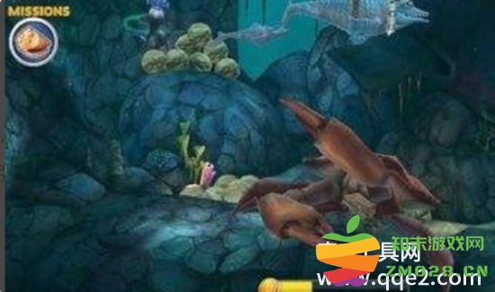 3、对弱点冲刺攻击。攻击成功,螃蟹会暂时逃开,我们的鲨鱼趁机到周围捕食进餐马上回来。(注意不要出洞)循环数次,即可击败巨型螃蟹。