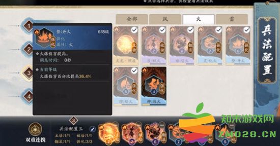 2、主动兵法:主动火加强最多,主动风伤害和范围都有不俗的提升,主动雷趋于平凡。
