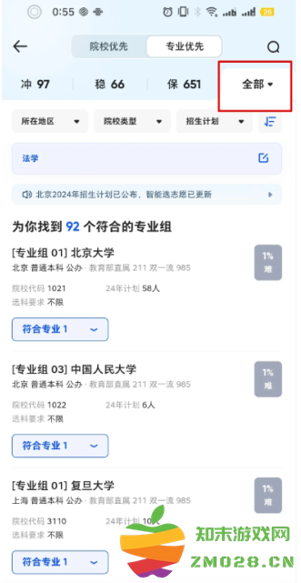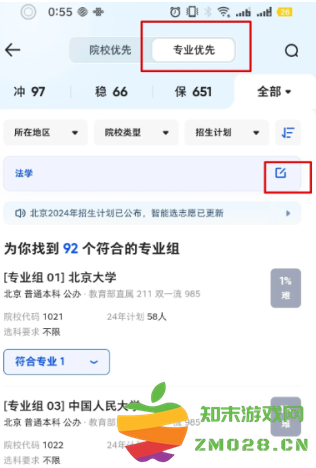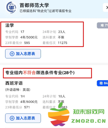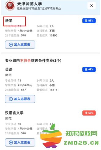 6,逐个点击“符合专业”按钮,关注该院校该专业招生信息和录取难度(比照该专业录取位次——注意不是院校最低录取位次),关注该专业组下“不符合筛选条件”的专业;