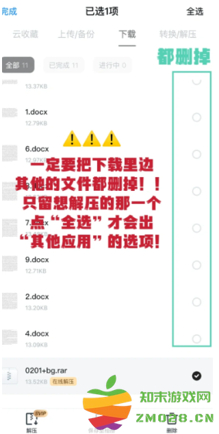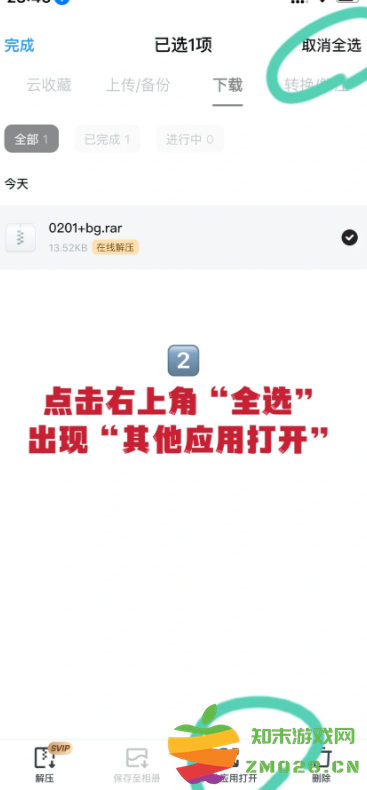 2,点击右上角“全选”,出现“其他应用打开”,注意这一步一定要把下载里边其他的文件都删掉!!只留想解压的那一个,点“全选”才会出“其他应用”的选项!