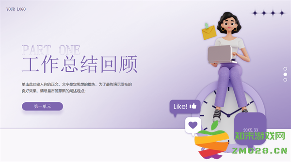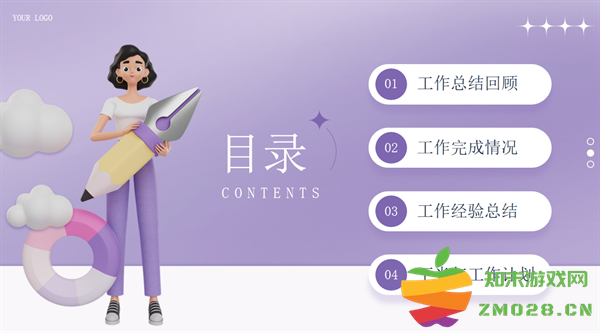 这是一套紫色3D立体风年终工作总结PPT模板,共17页;