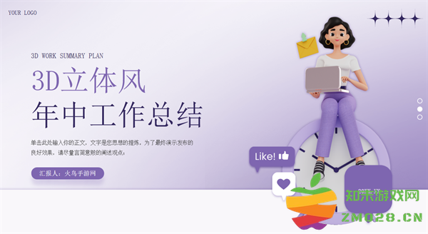 PPT模板封面,使用了3D立体女孩背景图片。左侧填写3D立体风年中工作总结PPT标题,设计风格为3D立体风。