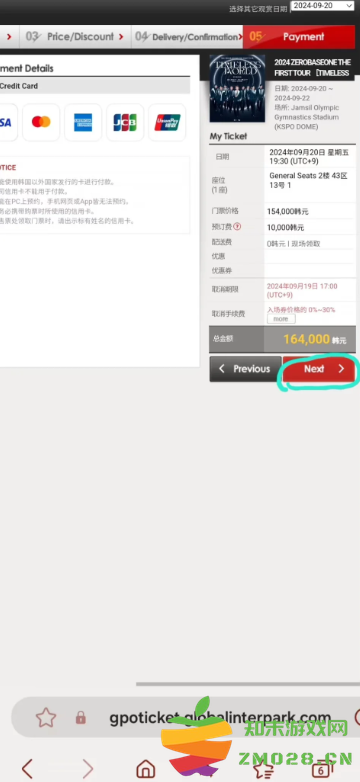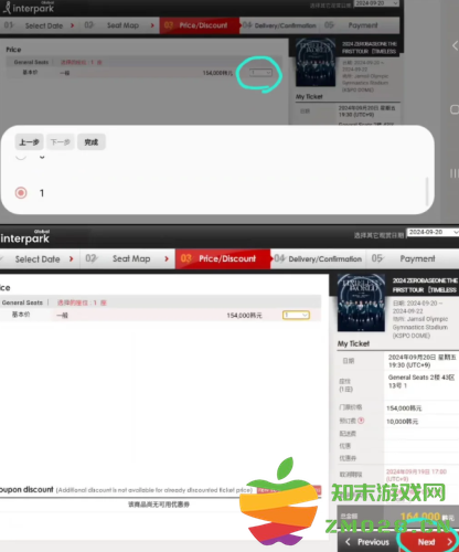 5. 页面成功跳转后即为暂时锁座成功,如果买1张票,则下拉列表中选择相应票数1,以此类推。完成后点【next】。