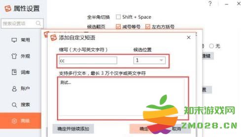 然后,在添加自定义短语窗口内输入“缩写”、“短语内容”,选择“候选位置”,再点击“确定”选项。