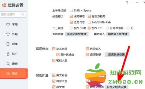 待属性设置面板弹出后,依次点击“高级”、“自定义短语设置”选项。
