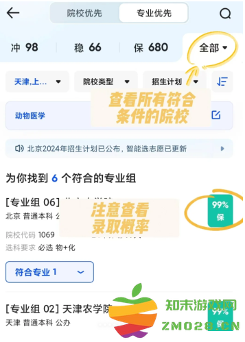 5,查看符合条件的所有院校(可以在顶部选择【院校优先】or【专业优先】),注意右侧的录取难度;