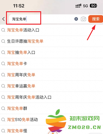 1,淘宝主页搜索处写淘宝免单,然后点击搜索按钮就可以了,记住只需要输入【淘宝免单】这几个字就可以了哈。