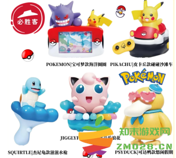 五款宝可梦玩具:皮卡丘、杰尼龟、胖丁、可达鸭、宝可梦款海洋圈圈
