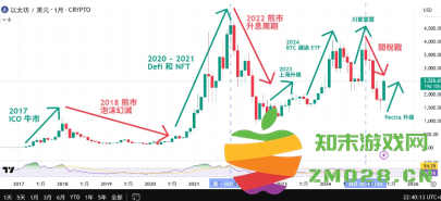 自2015 年以太币(ETH)正式上线以来,其价格历经多次牛熊循环,受市场叙事、技术升级、宏观政策与资金流动多重因素交织影响,展现极高波动与叙事驱动特性。以下为重要节点与趋势回顾: