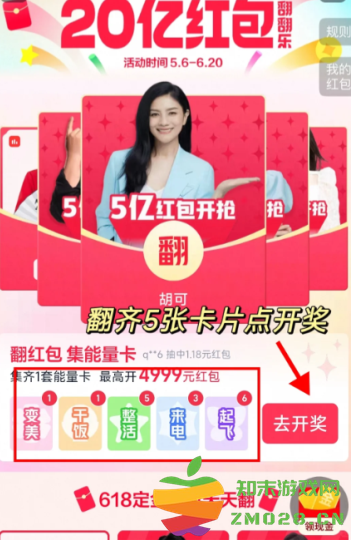 2025年5月6日00:00:00至2025年6月20日23:59:59,单用户进入会场可通过翻红包/随机翻收集能量卡,进入直播间有机会领取“变美”、“干饭”、“整活”、“起飞”、“来电”五种任一能量卡,集齐一套即可开奖,最高可获得4999元的直播翻翻乐。