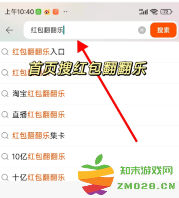 1,打开淘宝app,在顶部导航栏的位置搜索【红包翻翻乐】,点击搜索;