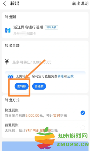 4进到余利宝的界面,点转出,中间的对话框写着余利宝可直接免费转账和还款,这句话下边有两个蓝色可选项,点左边的去转账,选择自己名下的银行卡,输入金额,付款方式选择余利宝