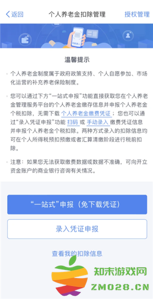 “一站式申报”功能直接获取您在个人养老金管理服务平台的个人养老金缴存信息并申报个人养老金个税扣除,无需下载个人养老金缴费凭证 。